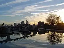 In 1849 James Rendel was asked to devise a scheme to improve the infrastructure, which was dilapidated. He reported that "if [the Navigation] is to compete successfully with Railways, it should be made an efficient branch of the Thames, viz. navigable by the largest class of barges there employed".[24] He proposed, besides numerous improvements on the river proper, the reconstruction of Bromley Lock; deepening the Limehouse Cut; forming a towing path under Britannia Bridge (Commercial Road); and the construction of a new outfall lock into the Thames, with cills 19 feet below Trinity High Water, and with tide gates.[25]