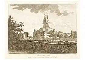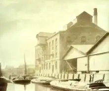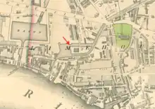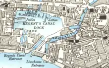 John Cary's New and Accurate Plan of London of 1795 shows that, by that date, a portion of the canal, near its outlet at Limehouse, had been expanded to form a large basin, with an island in the middle marked "Timber Yd", accessible by a causeway.[75] This was the first basin in Limehouse, built 25 years before the better known Regent's Canal dock which now bears that name.