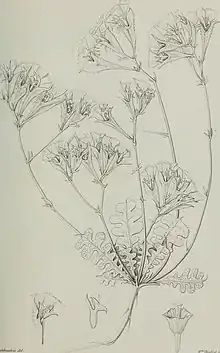 Limonium bonduellei, the yellow statice (a name it shares with Limonium sinuatum), is a species of flowering plant in the family Plumbaginaceae.[2] The Global Biodiversity Information Facility calls it Algerian statice and lists it as Limonium sinuatum subsp. bonduellei, but a 2018 molecular study showed that it is good species with 100% bootstrap support.[3][4] An annual facultative halophyte reaching 50 cm (20 in), it is native to Spain and North Africa, and has been introduced to Italy.[5][1] It is naturalized in New Zealand.[2]