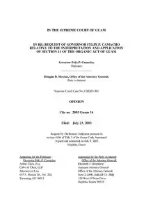 - 1 2 Governor Felix P. Camacho v. Douglas Moylan, Office of the Attorney General in re: request of Governor Felix P. Camacho relative to the interpretation and application of section 11 of the Organic Act of Guam (2003 Guam 16), Supreme Court of Guam Case No. CRQ03-001