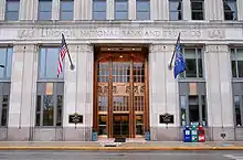 Seven bronze panels at the main entrance depict scenes from the life of President Abraham Lincoln.[5] The building is constructed of 1,774 tons of structural steel, faced with 21,250 cubic feet of cut Indiana limestone and granite with gold highlights. It features lead spandrel panels, a 58-ton terra-cotta crown, and 500 tons of marble. At the top of the building is a slender observation tower topped by a flagpole.