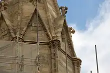 Lincoln Cathedral is one of the few English cathedrals built from the rock it is standing on.[45] It is mostly built from Lincolnshire Limestone.[46] The cathedral has owned the existing quarry, on Riseholme Road, Lincoln, since 1876.[47] As of 2016, the quarry was expected to run out of stone in 2021.[48] The cathedral's stonemasons use more than 100 tonnes of stone per year for maintenance and repairs.[48]