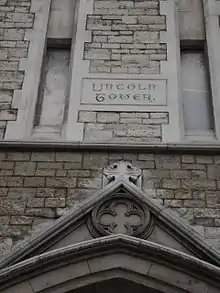 On the Tower's north entrance, above the apex of a large archway, a stone was added bearing the title Lincoln Tower. Under the paved basement the coffin of preacher Rowland Hill was re-located from Surrey Chapel, with a tablet inset into the interior wall above. There was another tablet in memory of his successor, James Sherman, with a still larger tablet giving the name and purpose of the tower – to commemorate emancipation by the martyred Lincoln, the contribution of half the cost of the tower by American citizens, and as a pledge of international brotherhood.