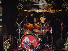 As a member of The Iron Maidens, McDonald's stage name is "Nikki McBurrain," an amalgamation of Iron Maiden's former drummer Clive Burr and their current drummer Nicko McBrain.[2] And much like McBrain with his drum kit, McDonald has hers decorated with a Sooty puppet.