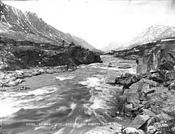The caption for an 1897 Frank La Roche photograph refers to it as the Lewes River and featured in En Route to the Klondike (1898) with text saying: "Skill, cool heads and hard work are the necessary requirements for navigating the rapids of the Lewes River. Here is portrayed an exciting scene, similar to which everyone who goes to the Klondike in the same way must experience. Partly guided by ropes in the hands of men ashore and steered clear of dangerous rocks by men in the boat, the frail craft dashes and struggles along, at one time miraculously escaping destruction in a wild eddy and at another time gliding gracefully between jagged rocks that rise threateningly out of the seething waters. There is no time to think - a sharp lookout and a steady hand are the only means to victory over the angry waters of the rapids one meets en route to the Klondike."[2]