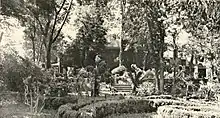 HHF built the Japanese garden between "Lindenshade" and his daughter's summer house, "Sub Rosa."[17] He even hired a Japanese gardener to maintain it.[17] "I like to lean on the bridge in the Japanese garden and watch the fishes in the water and the birds as they come to drink—Yesterday I stood there so motionless that a dear blessed wood-robin came within less than two feet of me & gathered up some mud and straws for her nest. Today I stood and drank in the beauty of the azaleas; never have we had them so resplendent. Then I strolled to Gan Eden where the prophetic eye beholds a beautiful spot, brilliant with every hue. The bamboo is a miracle. It grows a full inch a day, and so vigorous." — HHF to his sister (Mrs. Caspar Wister), 17 May 1898.[13]: 16
