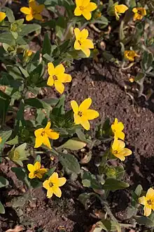 Lindheimera texana is a plant that is 6 to 24 inches (15 to 61 cm) tall. Leaves on the lower half on the plant are alternate and coarsely toothed, but on the upper half are opposite and smooth on the edges.[2] Each flower head has five bright yellow ray flowers, each with two prominent veins and indented at the tip.[2] The flowers will be at least 1โ1.25 inches (2.5โ3.2 cm) in diameter. The flowers will grow within 2 inches (5.1 cm) of each other.