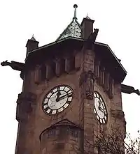 The Lindley Clock Tower is the most prominent landmark in Lindley,[2] standing at the junction between Lidget Street and Daisy Lea Lane. This Art Nouveau clock tower was designed by the Manchester architect Edgar Wood in 1900 and erected by James Nield Sykes JP, in 1902. The tower also features four buttress figures, four gargoyles and four friezes. The top of the tower is accessible via the doorway at its foot.