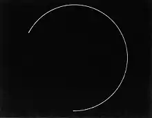 The idea for Line Describing a Cone came to McCall on his voyage from London to New York, where he produced the film in 1973. Though he had already created a number of other 16mm films, Line allowed him to actualize his ideas on the relationship between viewer and film and the medium of film itself.[2] The thirty-minute film begins with a single white dot projected onto a black surface. As time progresses, the dot begins to form a curved line, tracing the circumference of a circle until the end of the line reaches its starting point.[3] Meanwhile, particles in the air reveal the path of light in the space between the projector and the wall, making visible a cone of light.[4] If the artist's display specifications are met, this beam of light projects between thirty and fifty feet. The circle that is projected onto the surface sits approximately twelve inches above the ground, and its diameter spans seven to nine feet.[5] The exhibition space lacks seating, inviting the viewer to interact with the ray of light beaming from the projector to the screen. When multiple spectators view the piece together, these encounters with the light, at once an interruption and component of the piece, become an interaction with other audience members.[4]