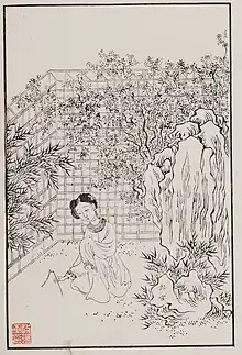 Described as beautiful and graceful, Lingguan is also the best singer in the 12-girl troupe belonging to the Jia household. She is only about ten years old and specializes in xiaodan roles. She makes her first appearance in Chapter 18, when she refuses Jia Yuanchun's request to perform two arias from A Thorn Hairpin: she performs arias from The Peony Pavilion instead.[2] Later, Jia Baoyu notices the love she has for Jia Qiang which impresses him.[3]