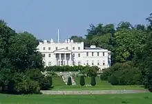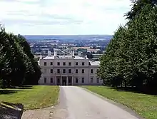 Due to the slope of the site, the south façade, which overlooks the main part of the grounds, stands on a raised and terraced platform with the ground floor raised to first floor level and the basement becoming the ground floor. Above the terrace, the façade has the same general arrangement as the north façade, but the wings project slightly past the central section, which has a two-storey pedimented portico. Each wing previously had a single-storey bay at its centre but these have been removed.[11]