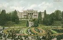 To the west of the house, Loudon laid out a flower garden. Later in the 1860s this was replanted with roses, but it is now lawns. At the south end of a walkway through this section of the garden is a water and rock garden known as "Jacobs Well". From the north end of the walk an avenue of giant sequoias planted in 1864 runs north-west towards the parish church of St Nicholas. Other Giant Sequoia are planted around the gardens. Close to the church, at the end of a paved walk is a small Gothic folly designed by Richard Bentley.[1][14] South of the avenue is a grass amphitheatre cut into the slope. The southern perimeter of the formal garden is formed by a ha-ha.[1] To the south, beyond the formal gardens, the steepness of the slope reduces and the estate continues as open parkland with a tree-fringed lake about 500 metres (1,600 ft) south of the house.[1]