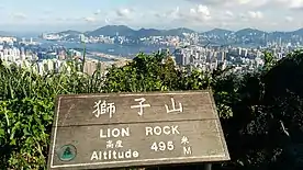 Lion Rock, or less formally Lion Rock Hill, is a mountain in Hong Kong. It is located in Sha Tin District,[1] between Kowloon Tong of Kowloon and Tai Wai of the New Territories, and is 495 metres (1,624 ft) high.[2] The peak consists of granite covered sparsely by shrubs. The Kowloon granite, which includes Lion Rock, is estimated to be around 140 million years old.[3]