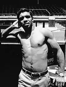 Rose won one more bout in 1966 and eight in 1967 (including a thirteenth-round knockout win against Rocky Gattellari to defend his Australian championship) before challenging Fighting Harada for the world bantamweight title on 26 February 1968 in Tokyo.[7] Rose made history by becoming the first Aboriginal Australian to be a world champion boxer when he defeated Harada in a 15-round decision.[8] This win made Rose an instant national hero in Australia and an icon among Aboriginal Australians. A public reception at Melbourne Town Hall was witnessed by a crowd of more than 10,000.[9] On 2 July of that year, he returned to Tokyo to retain his title with a 15-round decision win over Takao Sakurai. Then, on 6 December, he met Chucho Castillo at the Inglewood Forum in Inglewood, California. Rose beat Castillo by decision, but the points verdict in favour of him infuriated many in the pro-Castillo crowd and a riot began: 14 fans and fight referee Dick Young were hospitalised for injuries received.