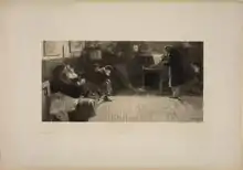 Music continued to inspire his art for decades. In 1898, he painted the Death of Mimì (illustrated below) (Museum of the City, New York), for which Balestrieri painted himself as Rodolfo. In 1899, he painted a canvas depicting Beethoven (Kreutzer Sonata),[2] This painting, which was awarded a prize at the 1900 Universal Exposition in Paris and in 1901 in Venice, brought him fame. The painting depicts a dimly lit garret-like apartment with a strand of listeners along the left wall, each in their own mood, while a violinist plays between them and a furnace. The face of the musician is hidden, and the wall has the empty gaze of a plaster mask of Beethoven.[3] Numerous reproductions were made and sold of the painting.