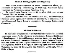 The family originated from the province of Kakheti and were elevated to the princely rank by King Heraclius II of Georgia in the mid-18th century. They were confirmed as the princes Lionidaev in Imperial Russia according to the decrees of 1825 and 1850.[1]