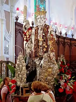 The thumbs of St Bartholomew: After Barbarossa sacked the church in 1544, the sacred relics were taken away to Asia Minor. A Spanish merchant acquired them and returned them to Lipari. "Il Vascello" ("the vessel"), or in the local dialect ("U Vascidduzzu"), is a masterpiece of silverwork by Perricone-Marano of Palermo containing 30 kg of silver and 2 kg of gold. According to the oral tradition, this commemorates in occasion after a terrible famine in 1672, when Lipari was struck by a storm, and French vessel agreed to bring some grain and donate the load to the islanders for free. The archbishop Angelo Paino commissioned the reproduction of the providential vessel in honour of the event two centuries later. Inside it is a fragment of St Bartholomew's skin.