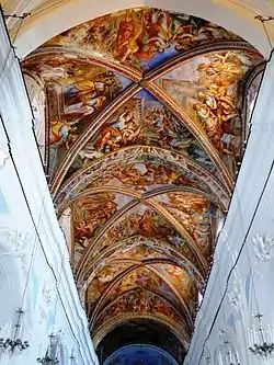 The central nave was initially covered by a trussed wooden ceiling, then with barrel vaults, and then with a series of groin vaults painted with high-quality frescos of biblical scenes.