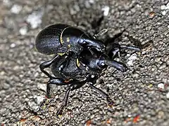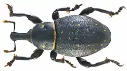 Liparus coronatus can reach a body length of about 11–13 mm (0.43–0.51 in).[3] These rather uncommon small weevils are almost completely shiny black. Pronotum is finely and densely punctured. The basal edge is lined with yellow scales throughout, with two large yellow scaly spots on each side. Femurs are strong and pointed.