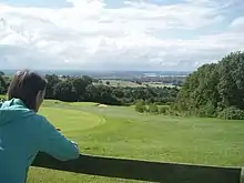 The hill was the site of a gun emplacement in the First World War and used as an anti-aircraft site in the Second World War.[1] The United States's 184th anti-aircraft artillery installed their own guns in 1941, and added an underground control room and block houses to the site.[1] A prisoner of war camp was established at Lippitts Hill by the British after the camp was abandoned by the Americans in 1944.[1] Relics from the Second World War at the camp include a memorial to the American forces that served there, and a concrete sculpture of a man, left by a German prisoner of war, Rudi Webber.[1] The local branch of the Peace Pledge Union, a pacifist organisation, would invite local prisoners of war from the camp to their homes on Christmas Day.[2]