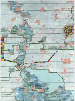 In the 2000s, Davis staked out an increasingly abstract and fluid position in canvases that resembled maps or networks and explored systemic, documentary and narrative impulses.[1][6][8] Situated more purely in painting, they dispensed with collage elements but retained that aesthetic through a dense layering of imagery and techniques.[1][6] Davis approached subject matter in a more subtle, open-ended manner balanced with formal concerns, expanding earlier examinations of racial, gender and identity codes into evocations of wider knowledge systems, often revealed as contingent and futile in terms of their ability to capture the plurality of life.[5][34][7][1]