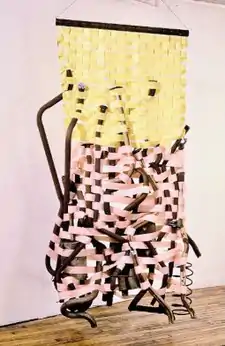 In the 1990s, critics such as Eleanor Heartney noted Hoke's shift toward denser, more playful hanging pieces that reworked the low-brow, recycled junk aesthetic of Pop assemblage and Arte Povera through a process-oriented, feminist sensibility.[11][10][35][36] These sculptures and installations utilized unmistakable household and auto-part detritus conveying usage and the chaos of real life.[8][11][37] The random color of the new materials reoriented Hoke toward chroma and texture; their status as functional objects introduced new, open-ended social and psychological shadings in her work: a sense of folly and the conditionality of existence, intimations of emotional stress, and commentary on domestic work that mixed obsessiveness with undercurrents of danger and disorder.[28][38][7][39]