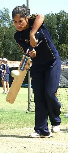 After both Australian openers fell for ducks, Sthalekar joined Karen Rolton at the crease with the score on 2/7 in the second innings. She made 40 from 122 balls and put on a stand of 115 with Rolton before being removed by Katherine Brunt, starting a steady flow of wickets as Australia were all out for 223 to leave the hosts a target of 306.[13] Sthalekar took 3/44 from 30 overs, including 16 maidens, removing captain Connor, Jenny Gunn and Beth Morgan as the hosts hung on for a draw with three wickets in hand.[8][13] In the Second Test at New Road, Worcester, Sthalekar made 34 and took 1/29, removing Brunt as the hosts made 289 and took a 158-run lead. In the second innings, she fell for a duck in Australia's 232, which left England a target of 75. Sthalekar took 0/4 as the hosts reached the target with six wickets in hand.[14] She ended the Tests with 77 runs at 19.25 and seven wickets at 21.00.[8]