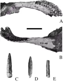 - ↑ Sciscio, Lara; Knoll, Fabien; Bordy, Emese M.; Kock, Michiel O. de; Redelstorff, Ragna (2017-03-01). "Digital reconstruction of the mandible of an adult Lesothosaurus diagnosticus with insight into the tooth replacement process and diet". PeerJ. 5: e3054. doi:10.7717/peerj.3054. ISSN 2167-8359. PMC 5335715. PMID 28265518.