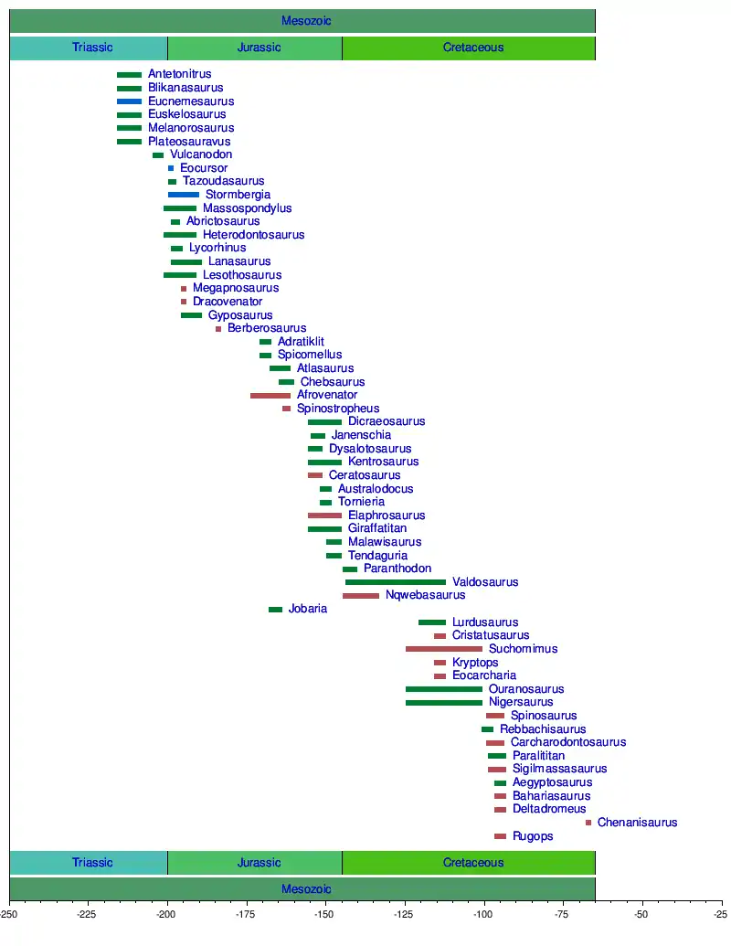 This is a list of non-avian dinosaurs whose remains have been recovered from Africa. Africa has a rich fossil record, but it is patchy and incomplete. It is rich in Triassic and Early Jurassic dinosaurs. African dinosaurs from these time periods include Megapnosaurus, Dracovenator, Melanorosaurus, Massospondylus, Euskelosaurus, Heterodontosaurus, Abrictosaurus, and Lesothosaurus. In the Middle Jurassic, the sauropods Atlasaurus, Chebsaurus, Jobaria, and Spinophorosaurus, flourished, as well as the theropod Afrovenator. The Late Jurassic is well represented in Africa, mainly thanks to the spectacular Tendaguru Formation in Lindi Region of Tanzania. Veterupristisaurus, Ostafrikasaurus, Elaphrosaurus, Giraffatitan, Dicraeosaurus, Janenschia, Tornieria, Tendaguria, Kentrosaurus, and Dysalotosaurus are among the dinosaurs whose remains have been recovered from Tendaguru. This fauna seems to show strong similarities to that of the Morrison Formation in the United States and the Lourinha Formation in Portugal. For example, similar theropods, ornithopods and sauropods have been found in both the Tendaguru and the Morrison. This has important biogeographical implications.