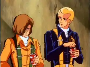 From left to right: Shin Kazama and Mickey Simon as depicted in the OAV series. In the TV series, Shin is depicted to have blonde hair.