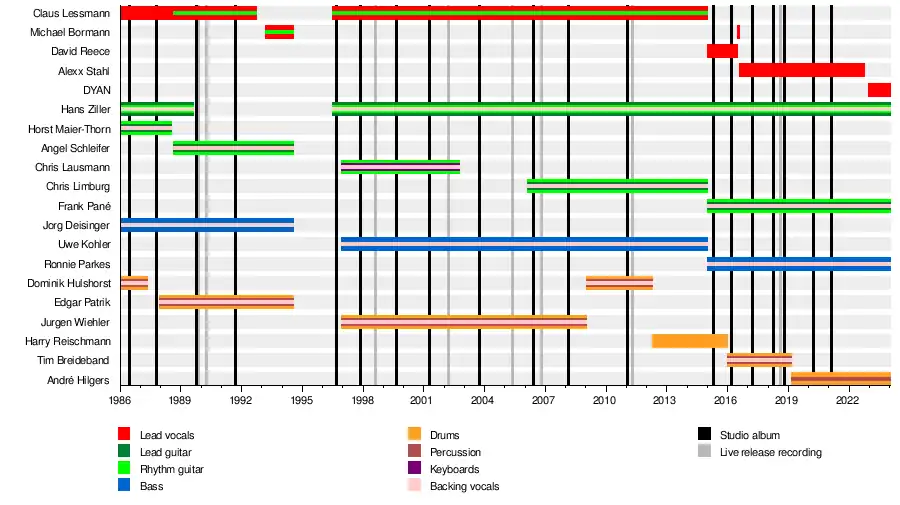 After not releasing a new album since 2011, Bonfire announced at the beginning of 2015 that Lessmann, Limburg and Köhler had all left the band, replaced by David Reece (formerly of Accept), Frank Pané and Ronnie Parkes, respectively.[18][19] The new lineup issued Glörious in April, before Reischmann was replaced by Tim Briedeband in December.[20] Pearls followed in March 2016, before Reece left that July due to "irreconcilable personal and professional differences".[21] The band's former vocalist Michael Bormann was originally slated to join as Reece's replacement, however he was unable to join until mid-October which led the group to bring in Alexx Stahl as a temporary stand-in for a short run of shows. Due to his performances, he was upgraded to an official member, instead of Bormann.[22]