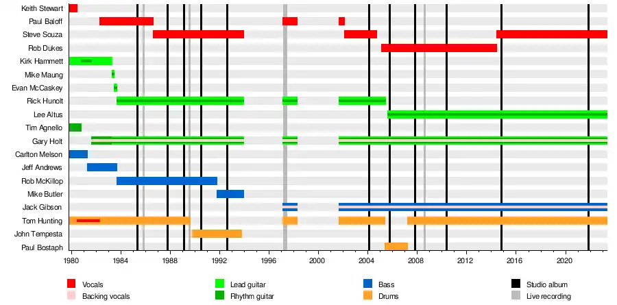 Exodus is an American thrash metal band from Richmond, California. Formed in 1979, the group originally included lead vocalist Keith Stewart, guitarists Kirk Hammett and Tim Agnello, and drummer Tom Hunting, who later added guitarist Mikey B, who left after six months.[1] Stewart left later, with Hunting handling lead vocal duties for a short period.[1][2] Agnello also left shortly after, leaving the band to continue as a trio.[3][4] Melson was replaced by Jeff Andrews around the same time.[1] Gary Holt joined as Agnello's replacement in 1981.[5] In 1982, the band added vocalist Paul Baloff, who performed on its first three-track demo the same year.[6] The following April, Hammett left Exodus to join Metallica, with Rick Hunolt quickly brought in to replace him.[7] Andrews later left to form death metal band Possessed, and was replaced by Rob McKillop.[7]