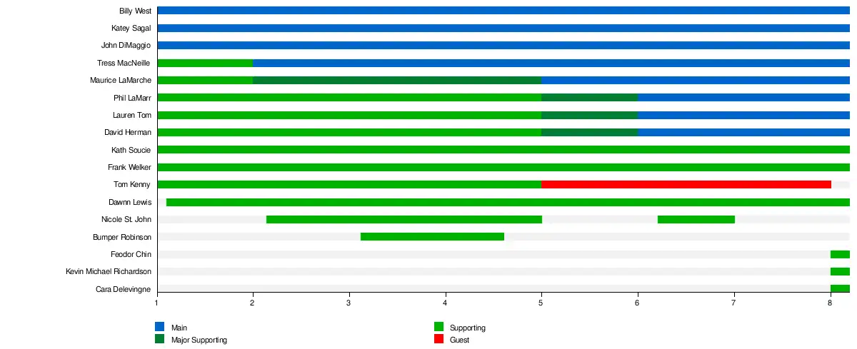 Guest stars have appeared on Futurama since its first season, in addition to the show's main cast of Billy West, Katey Sagal, John DiMaggio, Tress MacNeille, and Maurice LaMarche and supporting cast of Frank Welker, Kath Soucie, Dawnn Lewis, Nicole St. John and former supporting cast member Bumper Robinson. Phil LaMarr, Lauren Tom, and David Herman started as recurring actors in the first season, but joined the main cast starting with the sixth season. Tom Kenny was originally a recurring actor in the original run but became a guest actor since the fifth season. Feodor Chin, Kevin Michael Richardson, and Cara Delevingne joined the supporting cast in the eighth season.