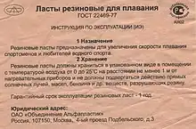 Instruction slip enclosed with Russian-manufactured swim fins certifying voluntary compliance with Soviet and post-Soviet GOST 22469-77 product standard