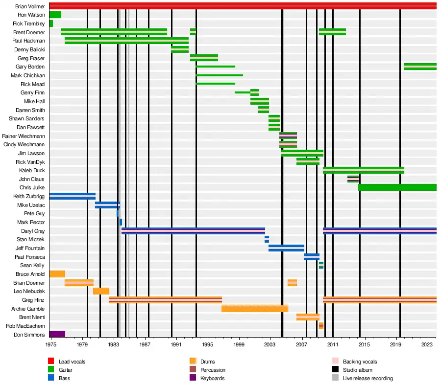 In June 2012, Helix announced that Brent Doerner would be leaving the band for a third time in September.[35] He was replaced by John Claus.[36] By February 2014, Claus had been replaced by Chris Julke, who recorded the band's next album Bastard of the Blues.[37] This was followed in 2019 by Old School, before Duck left in November that year and was replaced briefly by former guitarist Mark Chichkan and then by Gary Borden.[38]