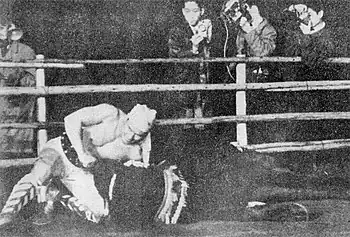 Kyokushinkaikan founder Masutatsu Oyama fighting a bull at the Denen Coliseum in 1956.
