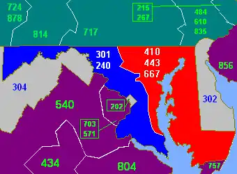 The blue area is assigned area codes 301, 240, and 227; the red area is area codes 410, 443 and 667