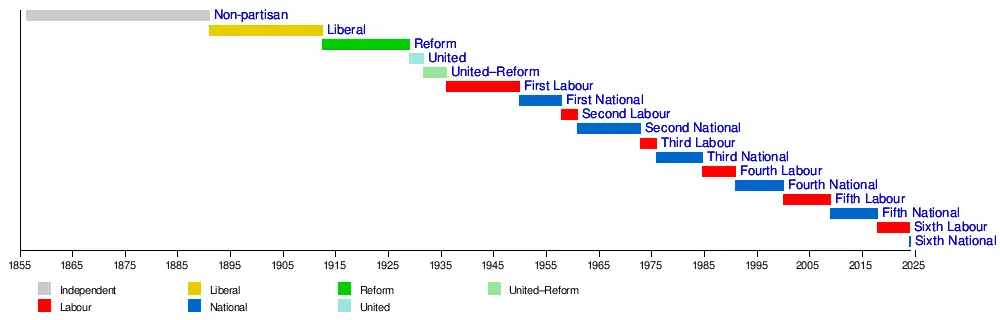 Sixth National Government of New ZealandSixth Labour Government of New ZealandFifth National Government of New ZealandFifth Labour Government of New ZealandFourth National Government of New ZealandFourth Labour Government of New ZealandThird National Government of New ZealandThird Labour Government of New ZealandSecond National Government of New ZealandSecond Labour Government of New ZealandFirst National Government of New ZealandFirst Labour Government of New ZealandUnited–Reform coalition Government of New ZealandUnited Government of New ZealandReform Government of New ZealandLiberal Government of New ZealandNon-partisan democracy