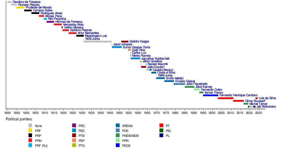 The president of the Federative Republic of Brazil is the chief executive of the government of Brazil and commander in chief of the country's Armed Forces. Below is a list of presidents of Brazil.
