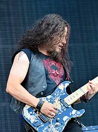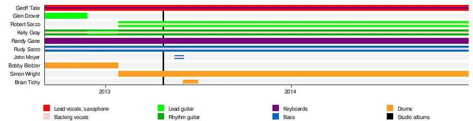 Tate's version of the band was announced in October 2012,[42] it included rhythm guitarist Kelly Gray (who had been a member of Queensryche), lead guitarist Glen Drover (Megadeth), keyboardist Randy Gane (Myth with Tate and Gray), bassist Rudy Sarzo (Ozzy Osbourne, Dio, Whitesnake, Quiet Riot) and drummer Bobby Blotzer (Ratt).[43] Drover later left in November[44] and was replaced by Sarzo's brother Robert (Quiet Riot, Hurricane),[45] and Blotzer was later replaced by Simon Wright (AC/DC, Dio, UFO).[46]