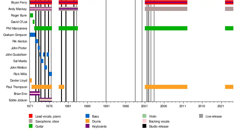 Roxy Music are an English rock band formed by in 1970 by singer Bryan Ferry and bassist Graham Simpson, who were soon joined by saxophonist Andy Mackay, synthesizer player Brian Eno, guitarist Roger Bunn and drummer Dexter Lloyd. By the time the band recorded their first album in 1972, Bunn and Lloyd had both departed, with drummer Paul Thompson (who joined in 1971) and guitarist Phil Manzanera (who joined just before recording began in 1972) alongside Ferry, Simpson, Mackay and Eno. The band split in 1976, reformed in 1978 and split again in 1983. Since 2001, Roxy Music has reformed several times for tours, but have not released any studio material since 1982's Avalon album. The band's current line-up, who last reunited in 2022, includes Ferry, Mackay, Thompson and Manzanera, augmented by backing musicians.