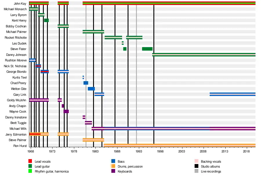 Ritchotte left Steppenwolf in 1989 to tour with the David Lee Roth Band,[18] returning the following year and remaining until late 1993.[17] During his time away from the band, he was replaced briefly by Les Dudek,[19] and later by Steve Fister.[20] Following his departure, Fister returned to Steppenwolf for another three-year run.[21] In 1996, Danny Johnson joined Steppenwolf in place of the departed Fister.[22] Bassist Gary Link rejoined the band in 2009.[23][24] In October 2018, at the end of the band's 50th anniversary tour, Kay announced that the group had officially retired.[25]