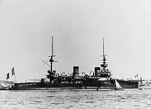 The ship's early career followed a similar trajectory to Charles Martel's; she spent much of it in the Mediterranean Squadron, and she too served with the International Squadron in 1897.[13] She thereafter began alternating stints in the Northern and Mediterranean Squadrons; she was with the Northern Squadron in 1901,[20] followed by a brief return to the Mediterranean as part of the Reserve Squadron in 1903.[21] The year 1904 saw her back with the Northern Squadron,[22] where she remained until 1907, when she was assigned to the 2nd Battle Squadron in the Mediterranean.[23] In early 1911, the unit was moved to Brest, France, before returning to Toulon later that year, where it was renumbered as the 3rd Squadron. Carnot was reduced to reserve in 1913 and was ultimately broken up in 1922.[24][25]
