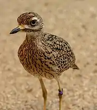 The thick-knees are a group of waders found worldwide within the tropical zone, with some species also breeding in temperate Europe and Australia. They are medium to large waders with strong black or yellow-black bills, large yellow eyes, and cryptic plumage. Despite being classed as waders, most species have a preference for arid or semi-arid habitats.