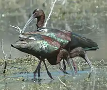 The family Threskiornithidae includes the ibises and spoonbills. They have long, broad wings. Their bodies tends to be elongated, the neck more so, with rather long legs. The bill is also long, decurved in the case of the ibises, straight and distinctively flattened in the spoonbills. Four species have been recorded in Iowa.