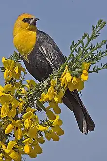 The icterids are a group of small to medium-sized, often colorful passerine birds restricted to the New World and include the grackles, New World blackbirds, and New World orioles. Most species have black as a predominant plumage color, often enlivened by yellow, orange, or red. Fifteen species have been recorded in Iowa.
