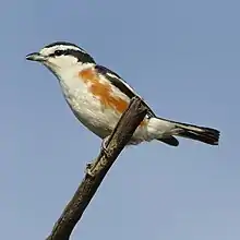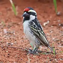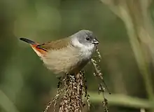 The estrildid finches are small passerine birds of the Old World tropics and Australasia. They are gregarious and often colonial seed eaters with short thick but pointed bills. They are all similar in structure and habits, but have wide variation in plumage colours and patterns.