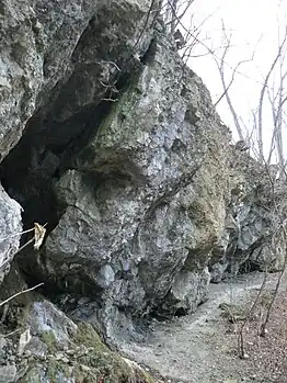 - Rocky Gap - Located in Tuscarora Sandstone about 350 feet (110 m) above the Rock Gap Run. This fissure cave extends 120 feet (37 m) to the southeast. The fissure averages five feet wide and five to ten feet high.[6]