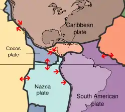 Earthquakes are relatively frequent occurrences in Guatemala.[1] The country lies in a major fault zone known as the Motagua and Chixoy-Polochic fault complex, which cuts across Guatemala and forms the tectonic boundary between the Caribbean Plate and the North American Plate. In addition, along Guatemala's western coast line, the Cocos plate pushes against the Caribbean Plate, forming a subduction zone known as the Middle America Trench located approximately 50 km off Guatemala's Pacific coast. This subduction zone led to the formation of the Central America Volcanic Arc, and is an important source of offshore earthquakes.[2] Both these major tectonic processes have generated deformations within the Caribbean plate and produced secondary fault zones, like the Mixco, Jalpatagua, and Santa Catarina Pinula faults.[3]