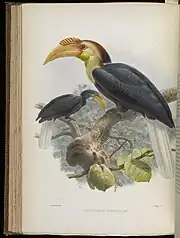 Hornbills are birds in the families Bucerotidae and Bucorvidae. There are currently 62 extant species of hornbills recognised by the International Ornithologists' Union, two in Bucorvidae and 60 in Bucerotidae.[1] Many species of fossil hornbills are known from the Miocene onwards; however, their exact number and taxonomy are unsettled due to ongoing discoveries.